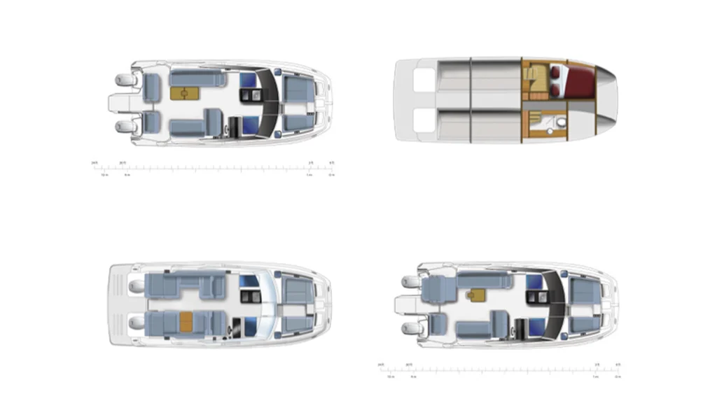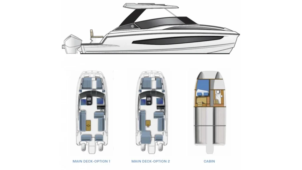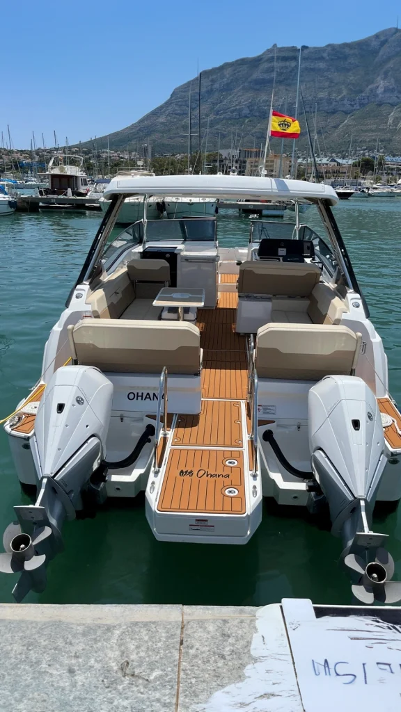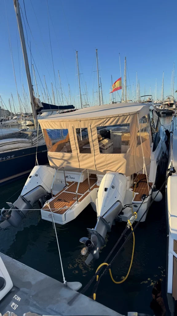 El interior costa de un amplio camarote y un cuarto de baño, mientras que la cubierta encontramos diferentes zonas de descanso y de recreo tanto en popa como en proa, así como una mesa central para comidas y aperitivos. Cuenta con un techo fijo que le permitirá disfrutar del sol y de sombra a selección. Además dispone de un techo bimini fijo en popa.
