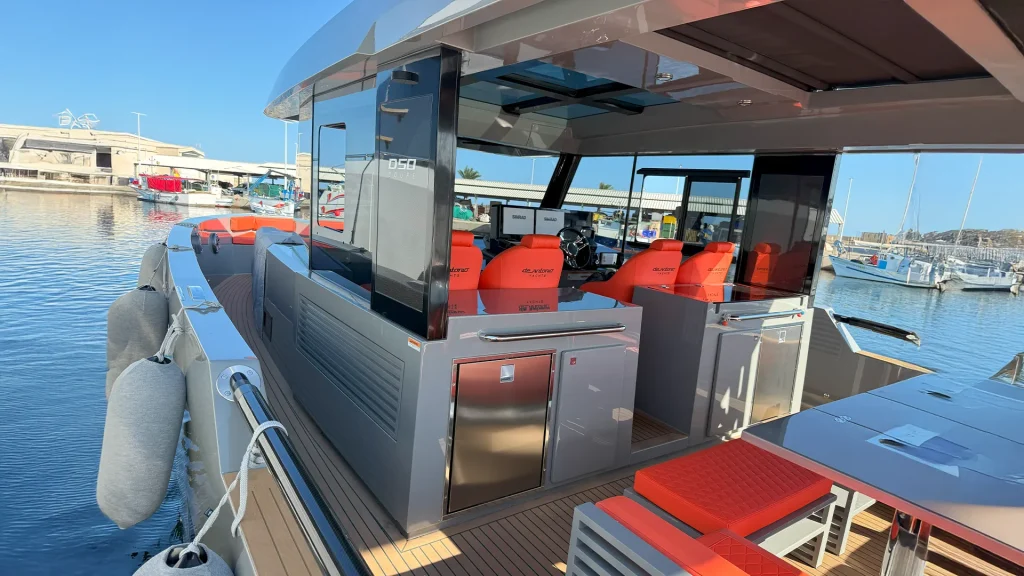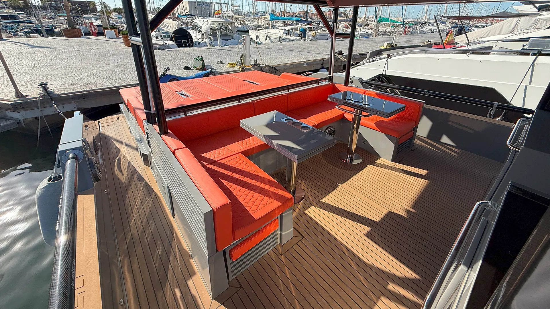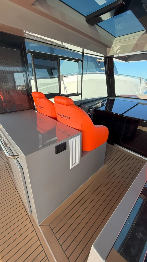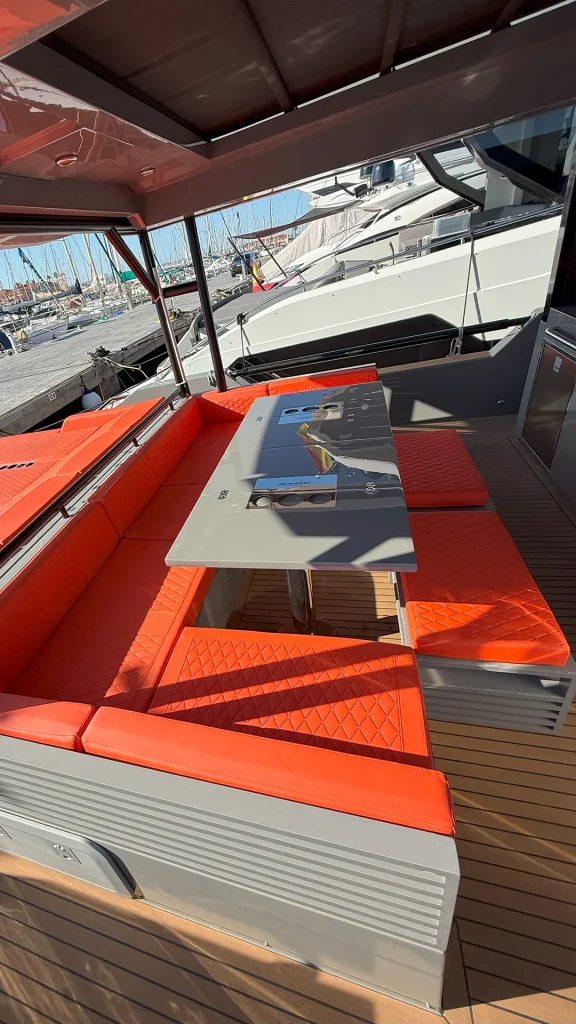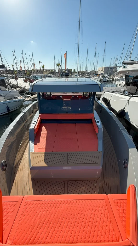 Impresionante D50 Coupé con casco gris oscuro y colchoneta en color naranja. Equipado con Hard Top integral, ideal para disfrutar de la navegación en invierno y verano con el máximo confort y estilo. Una oportunidad única para quienes buscan diseño, prestaciones y exclusividad. Equipado con dos motores Mercury de 600 HP.