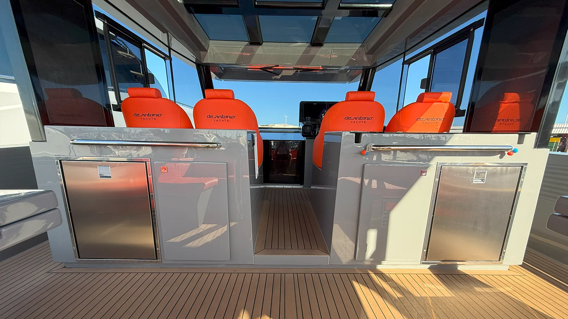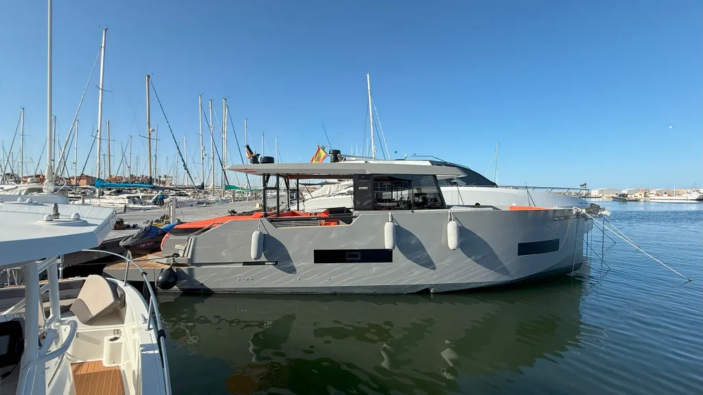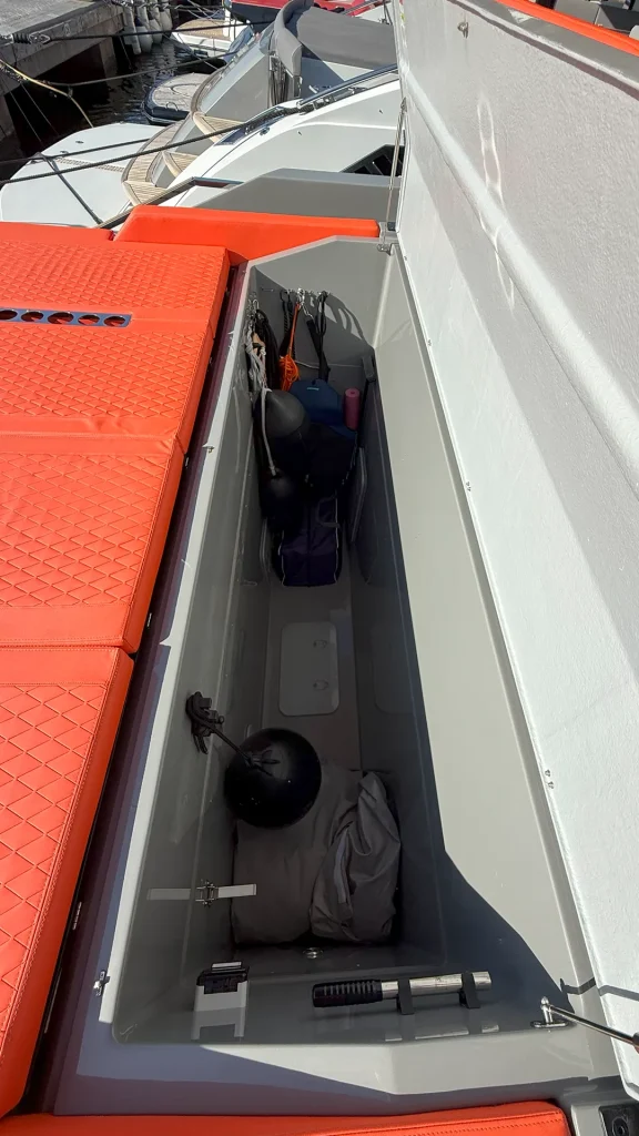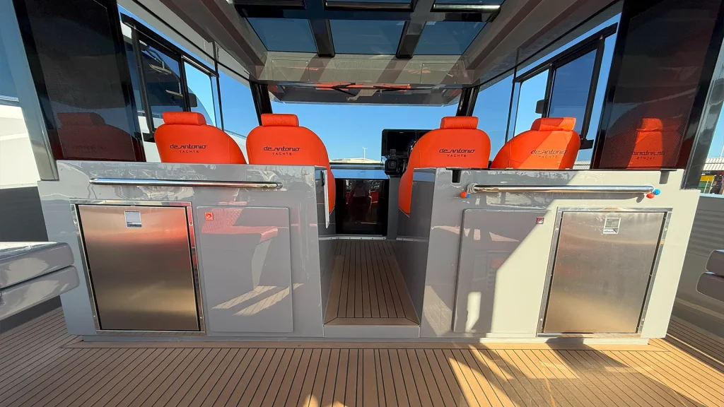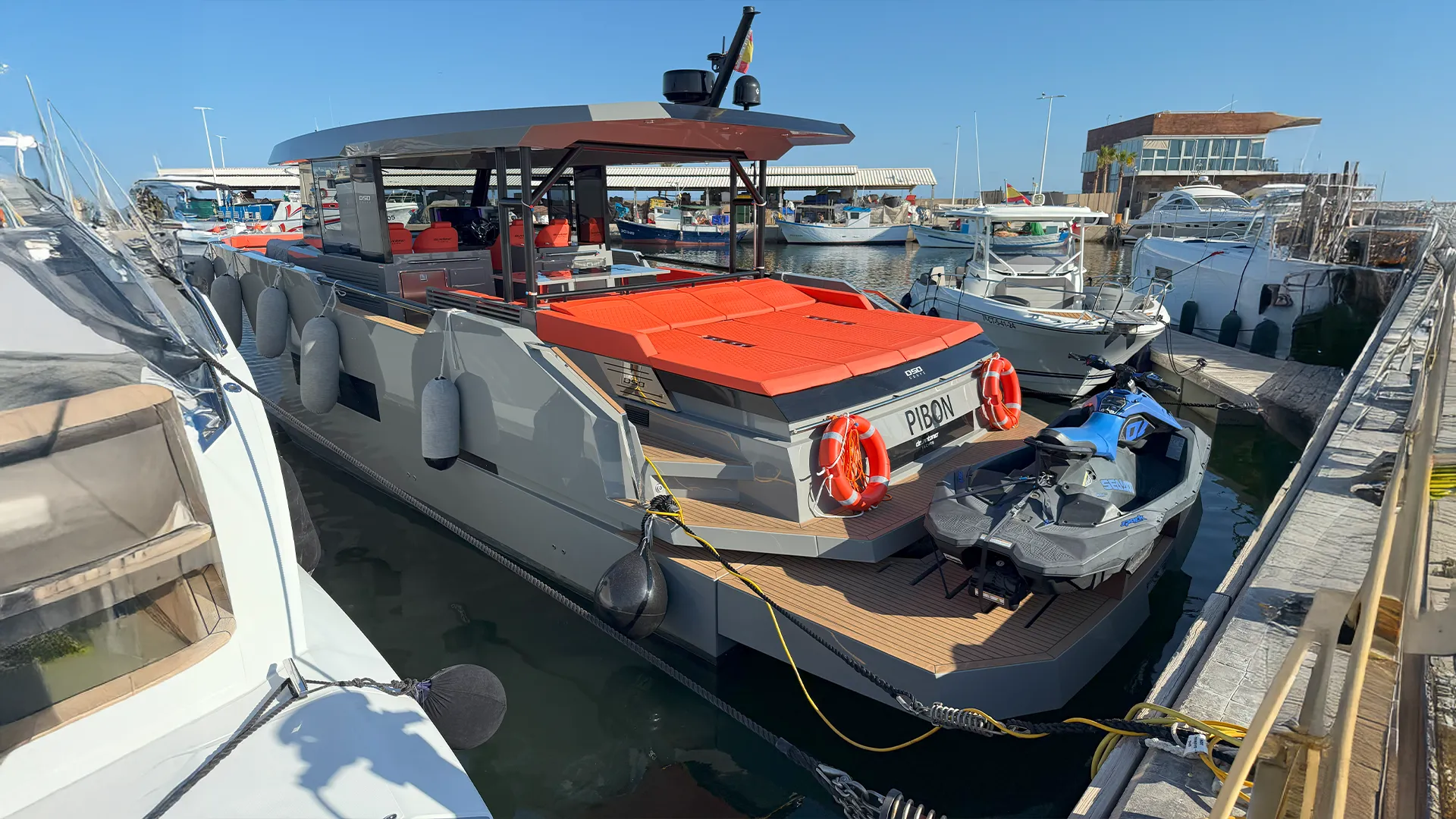 Impresionante D50 Coupé con casco gris oscuro y colchoneta en color naranja. Equipado con Hard Top integral, ideal para disfrutar de la navegación en invierno y verano con el máximo confort y estilo. Una oportunidad única para quienes buscan diseño, prestaciones y exclusividad. Equipado con dos motores Mercury de 600 HP.