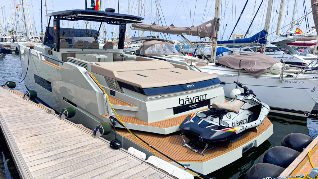 Este De Antonio Yachts D50, con casco en gris claro y colchoneta en color marrón, destaca por ser una de las configuraciones más elegantes y atractivas hasta la fecha.