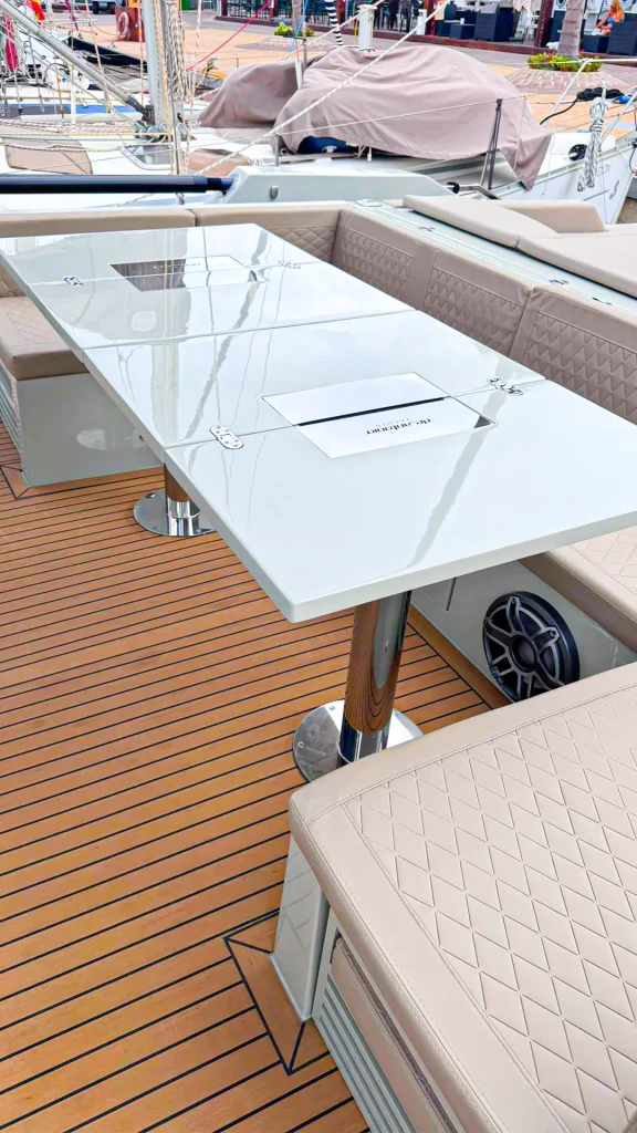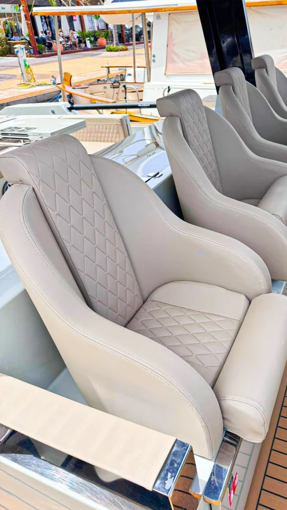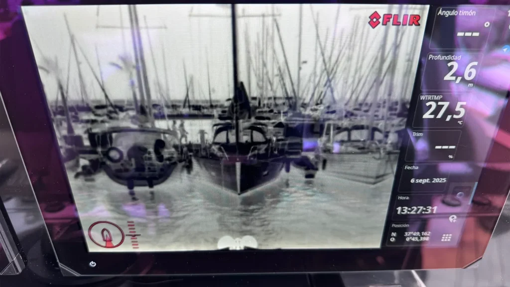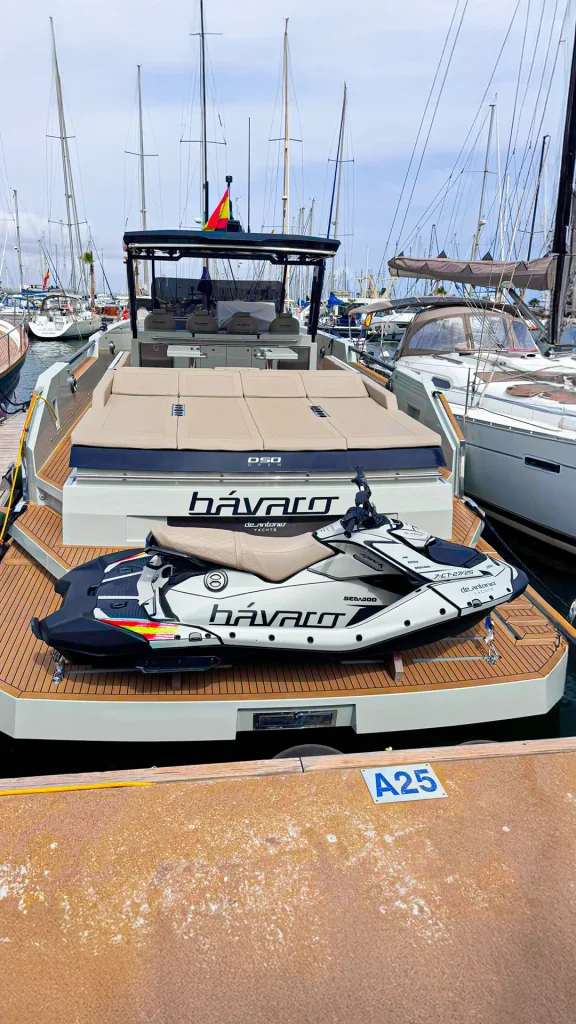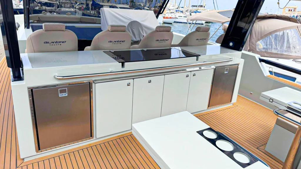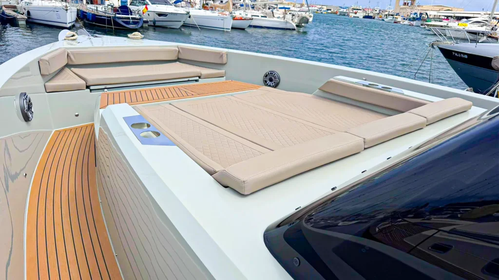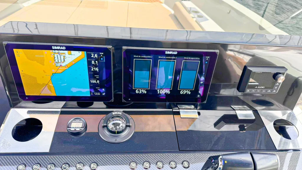 Entre sus extras más destacados: cámara FLIR de visión nocturna, antena 5G, sistema Dock Mate, AIS, VHF DSS de emergencia, nevera auxiliar en el garaje, sistema de autosuministro de gasolina para el tender, moto Spark… y muchos añadidos más.